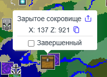* **Mark as found** — галочка в окне с координатами. Отмеченные структуры становятся полупрозрачными, чтобы не путать с новыми.