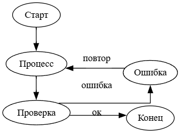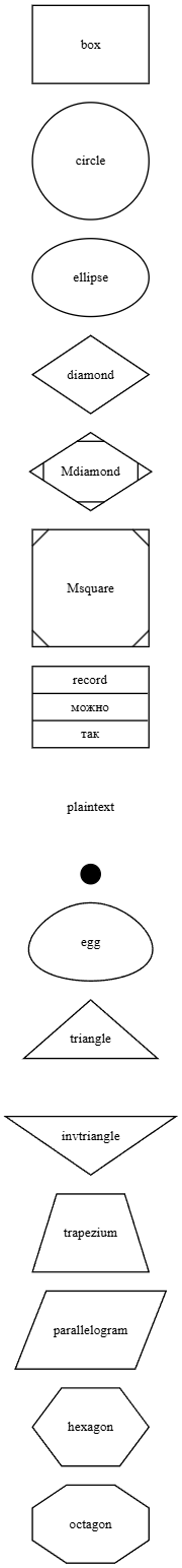 | `shape`            | форма узла                             | `box`, `circle`, `ellipse`, `diamond`, `Mdiamond`, `Msquare`, `record`, `plaintext` |
