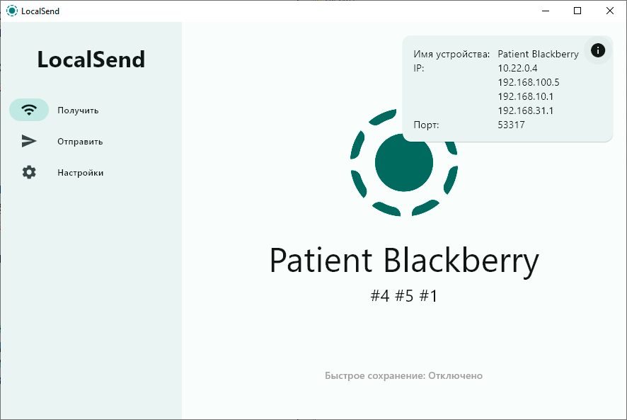 Получатель увидит уведомление и сможет принять или отклонить передачу. Если включить опцию **«Быстрое сохранение»** (в настройках), файлы будут приниматься автоматически и сразу попадать в указанную папку - удобно, если часто перекидываешь что-то себе между телефоном и компьютером.